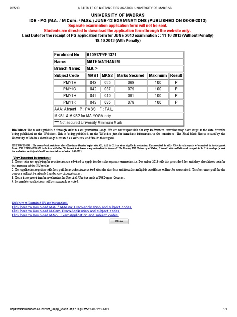 Madras University Distance Education Results 2019 Ide Declared